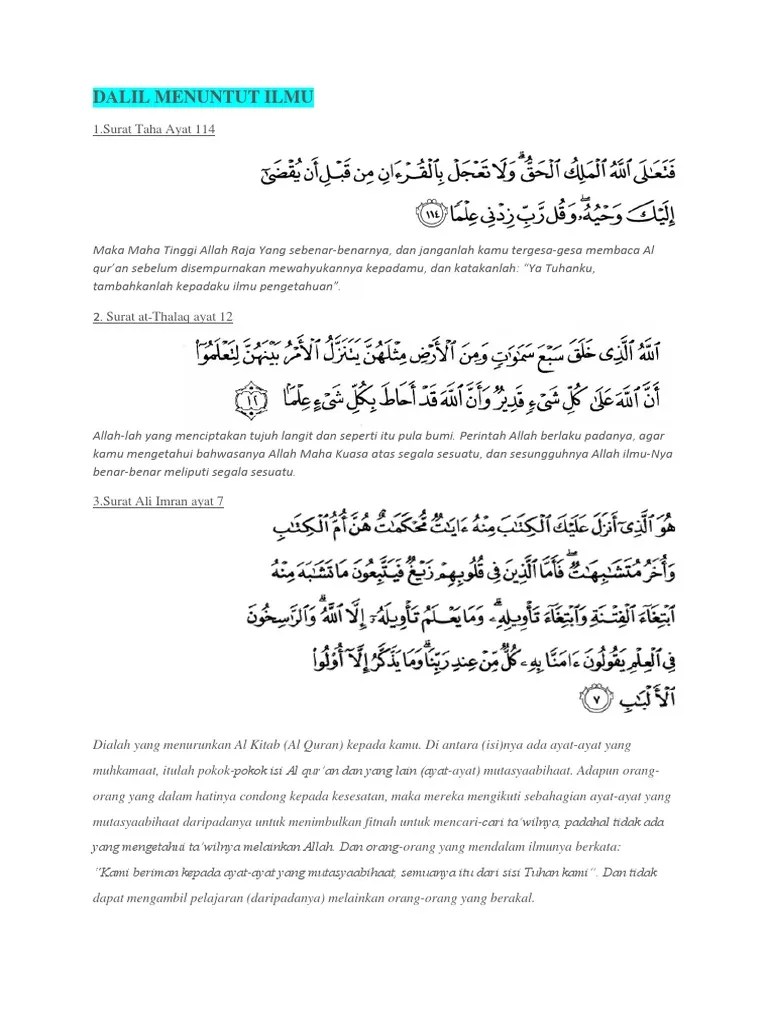 Dalil Mencari Ilmu : Ikhlas Dalam Menuntut Ilmu Dan Keinginan Meraih Gelar Atau Ijazah Artikel Sofyan Chalid Bin Idham Ruray - طَلَبُ الْعِلْمِ فَرِيضَةٌ عَلَى كُلِّ.. Enam syarat menuntut ilmu dalam kitab ta'lim muta'allim. Tolabul ilmi faridlotun ala kulli muslim" Firman allah dalam kitab yang paling suci dan dalil dalil hadith banyak mencerita kepentingan mencari ilmu supaya manusia sentiasa berfikir kearah kebaikan dan tidak terpesong dari akidah islam. ilmu yang diperoleh nantinya digunakan untuk memperbaiki diri sendiri dan lingkungan sekitar. Hal ini dikarenakan ilmu sendiri berperan penting dalam peradaban manusia.